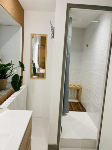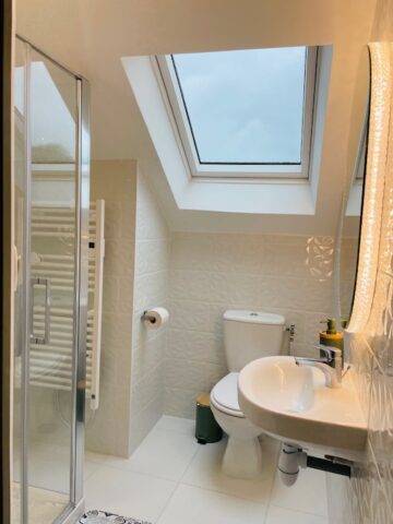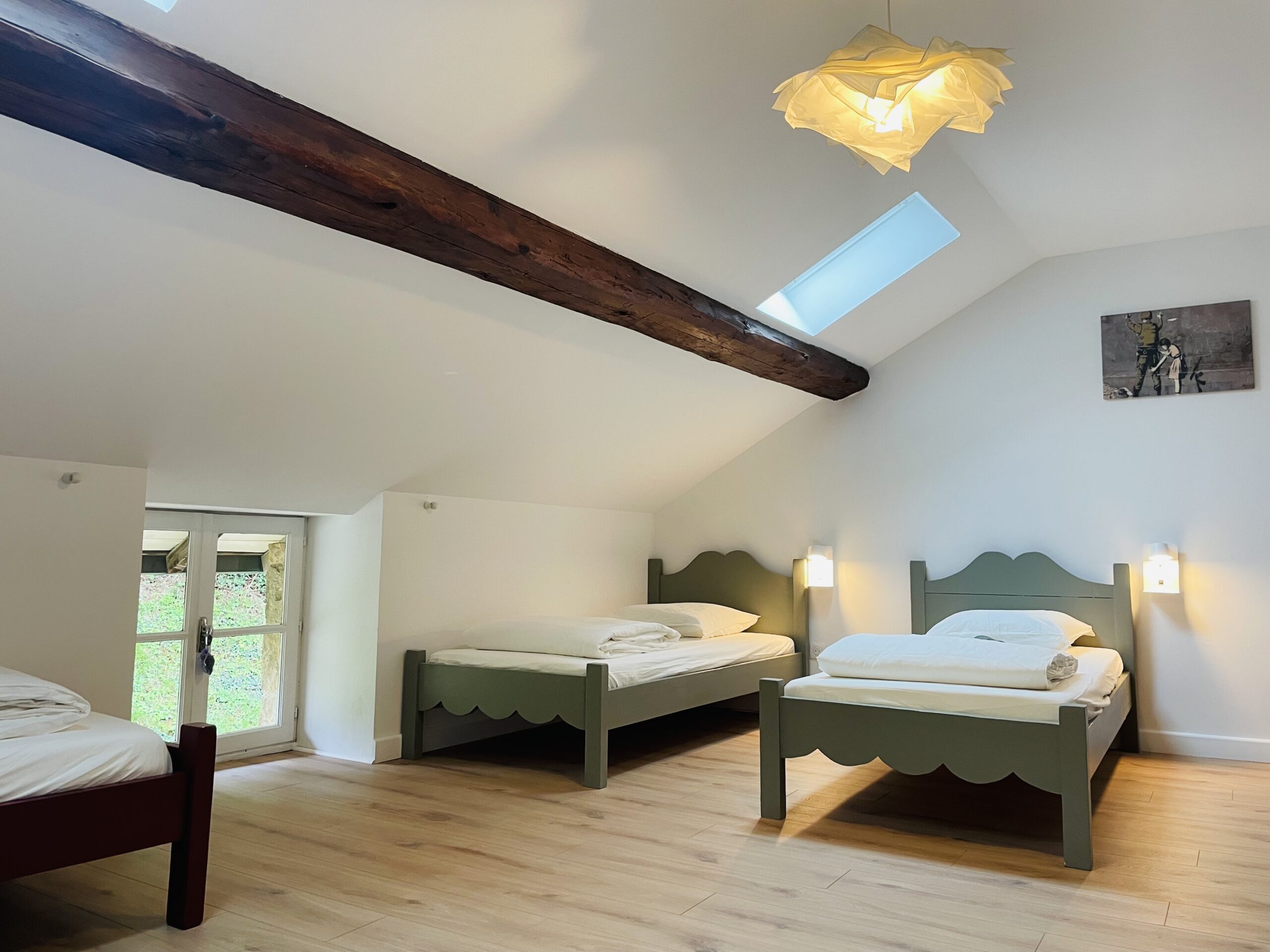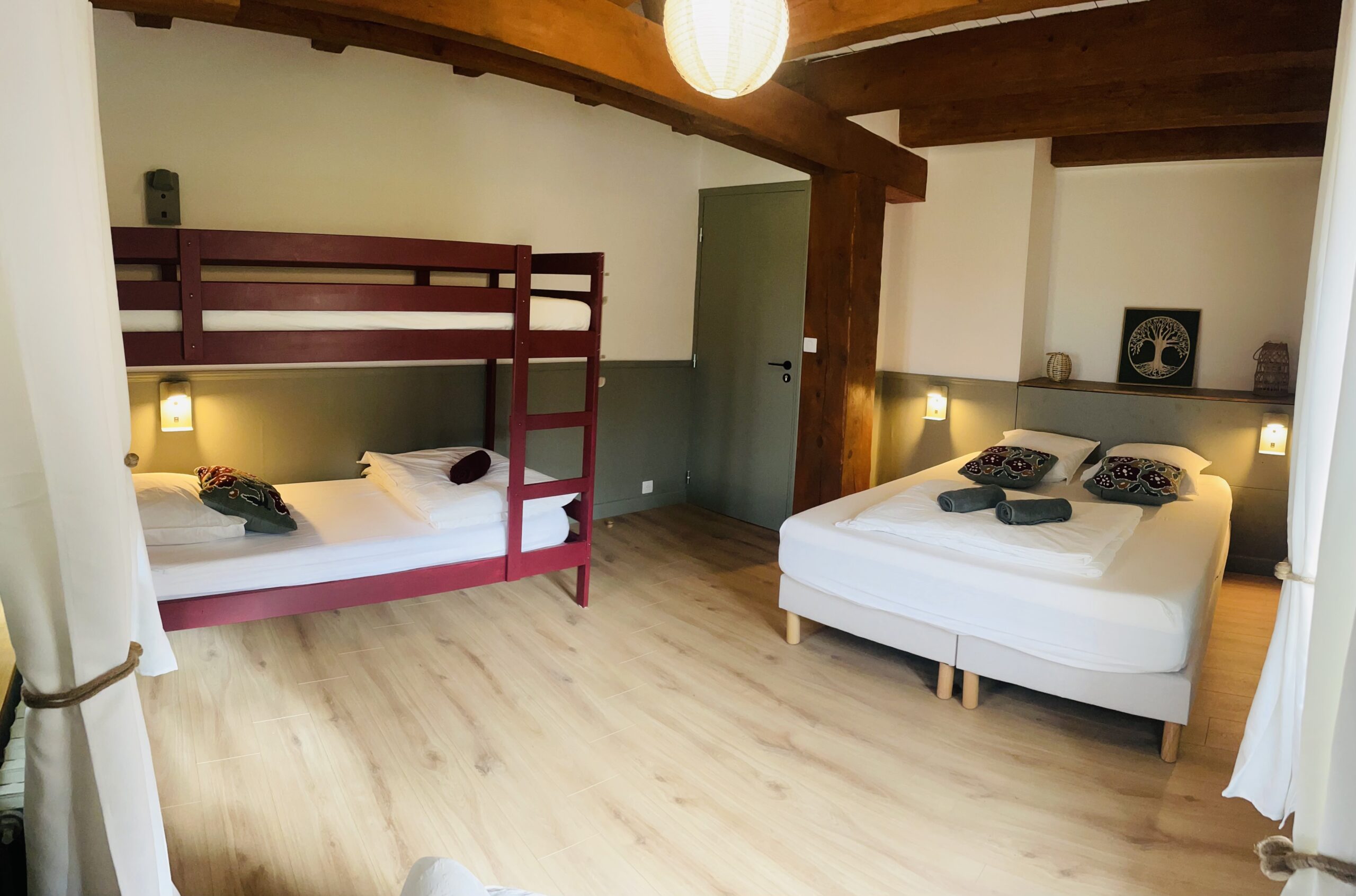 Au premier étage, 1 chambre avec lit double, 1 chambre avec lit double et 1 lit superposé, 1 chambre avec lit double et 1 lit simple, toilettes indépendants, salle de bains avec deux douches privatives.