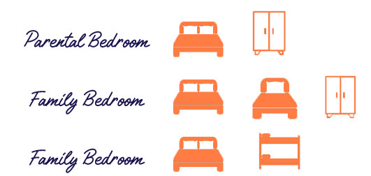 On the first floor, 1 bedroom with a double bed, 1 bedroom with a double bed and a bunk bed, 1 bedroom with a double bed and a single bed, separate toilets, a bathroom with two private showers.